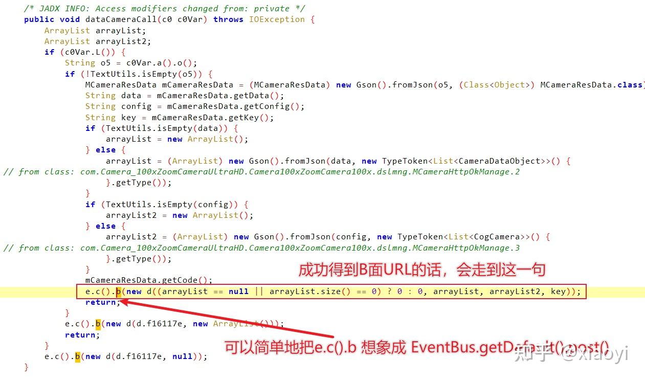 这里要科普一个知识点:EventBus的使用,它的作用是切断代码的联系,你只看到得到B面URL后post这个值到EventBus的队列,最终的执行是在EventBus调度中进行的,当执行到时,会调用onMessageEvent()方法