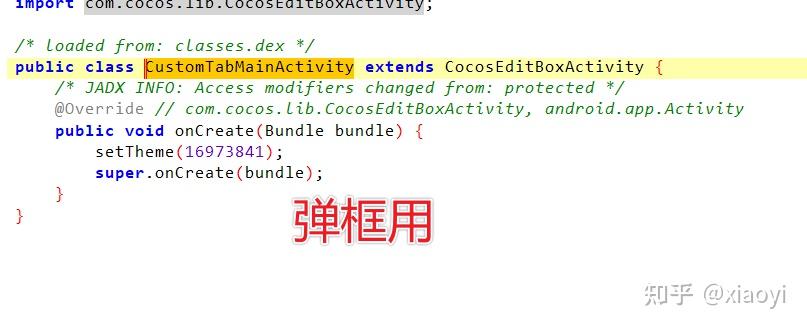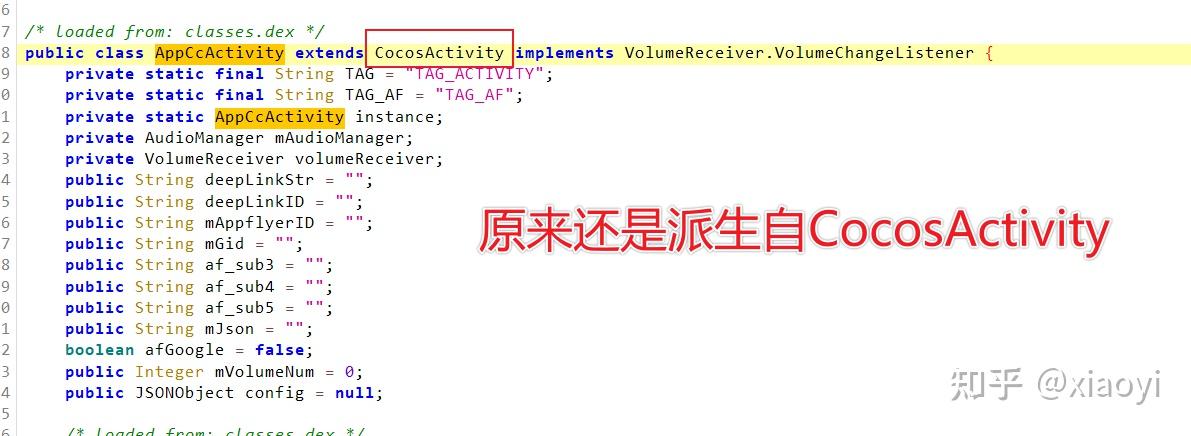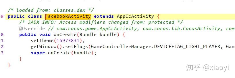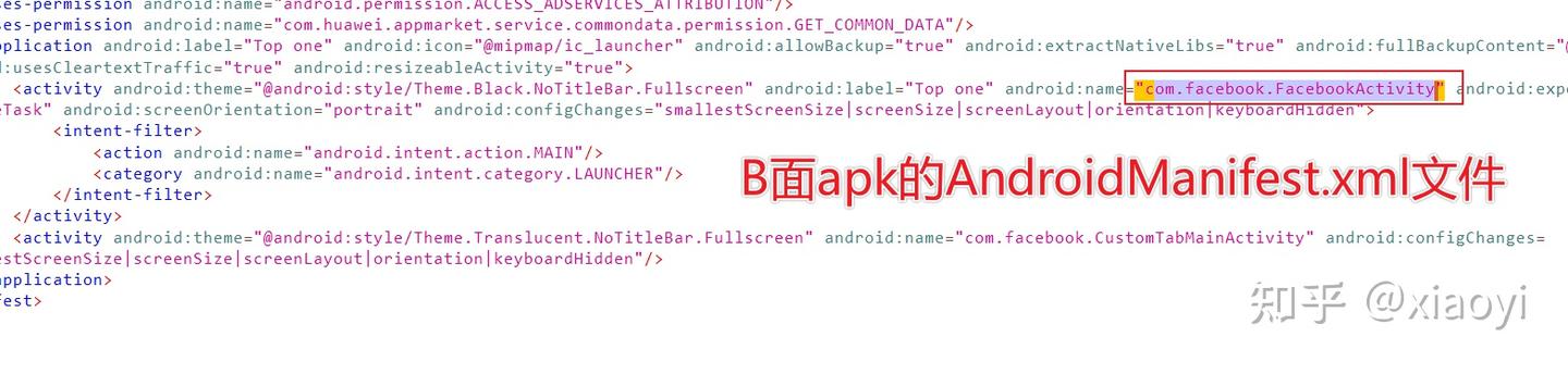 另外我们知道A面apk的AndroidManifest.xml文件中要放一个和B面主Activity同名的Activity,于是作者想到了om.facebook.FacebookActivity,这个类比较安全。于是,在B面APK里可以看到: